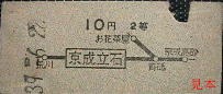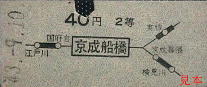 二等級制時代初期の券(京成立石、町屋、国府台)と後期の券(堀切菖蒲園、千住大橋、京成船橋)。後期の券は金額・等級表示が大きくなり、太線も太い。