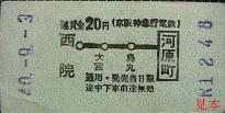 その後、発売された券は一般的な様式になった。上段は常備の手売り軟券で半円形の日付ゴム印が特徴、中段は券売機券で、西梅田の券のみ無地紋、下段はかなり旧式の券売機の券である。