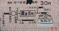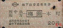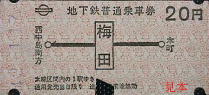 二重丸の駅は徒歩連絡を示しており、西梅田の券を例に取ると御堂筋線本町〜四つ橋線信濃橋(中央線開業の際、本町に統合)が徒歩連絡であることを示している。