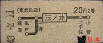 玉ノ井(現、東向島)の券には途中駅の北千住が書かれており、北千住への利用客が多かったことを示している。