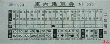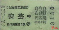 安芸線車内乗車券。軌道線の一部の駅も表示されている。
