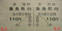 左は廃止目前の券売機券で緑一色の券紙で地紋はない。右は所謂1/2硬券で、大戦末期では各地で使用されたものだが、安芸線では晩年まで採用されていた。