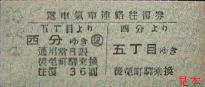 左は安芸線内用の往復乗車券、右は電車汽車連絡往復券で、この券は鉄道線西分(安芸線)と軌道線五丁目(桟橋線桟橋通五丁目)の往復となっている。
