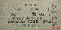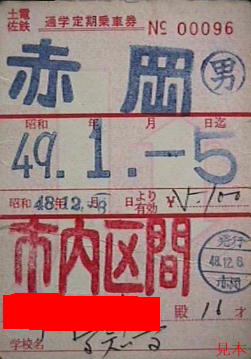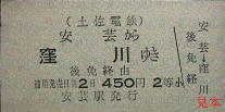 安芸線〜軌道線直通の定期券。日付が中央にあり、駅名を上下に配置した独特の様式である。