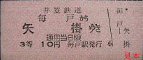 矢掛線の乗車券(左:三等級制時代、中央:二等級制時代)と神辺線の乗車券(右)。神辺線の乗車券は最終日の券だが、様式は三等級制時代の券であろう。