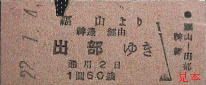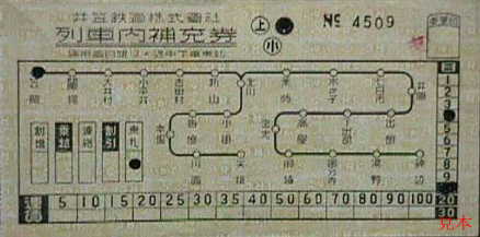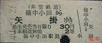 矢掛・神辺線廃止前の地図式車内補充券。駅名の「両備」「備中」が省略されている。