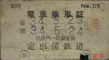 臨時電車乗車証。A型より一回り大きい軟券である。優待乗車券の様なものであろうか。