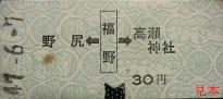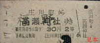 二等級制時代の乗車券。右は「高瀬神社ゆき」を「福野ゆき」にゴム印で訂正している。