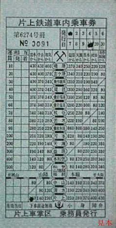 車内乗車券。何れも柵原側に「炭鉱」マーク、片上側に「錨」マークが書かれている。