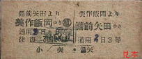 美作飯岡発行ののB型往復乗車券、大戦末期〜終戦直後に印刷されたもので、無地で粗悪な用紙が使用されている。