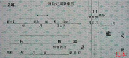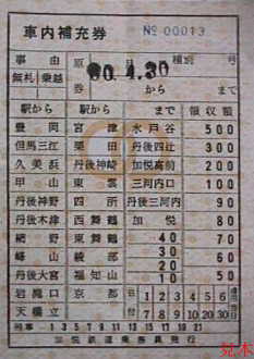 社内用車内補充券。上段は入鋏して使用する様式、下段は最下段が領収額で、額に応じて任意の場所で切り離して発行する様式。