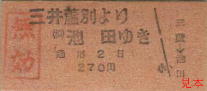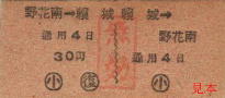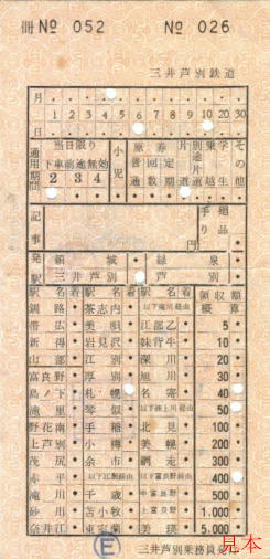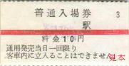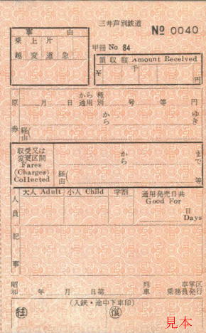 線内用の軟券乗車券。綴りになっている物を切り離して使用しているので、券片の位置によって大きさがまちまちである。