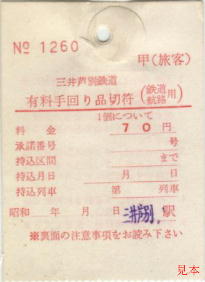 有料手回り品切符。典型的な赤刷りの荷札型券である。