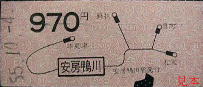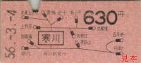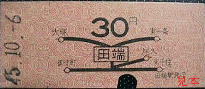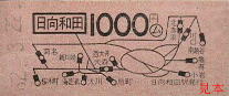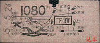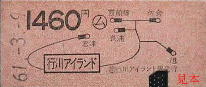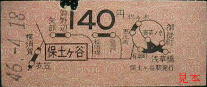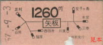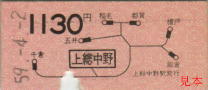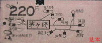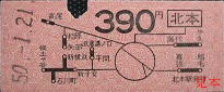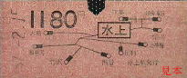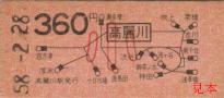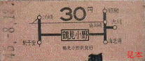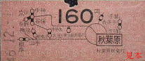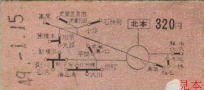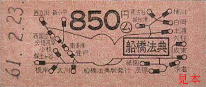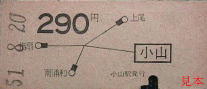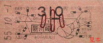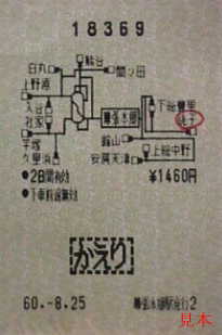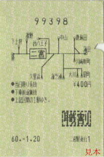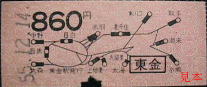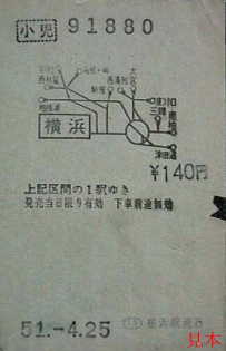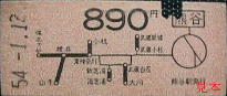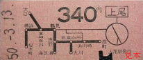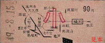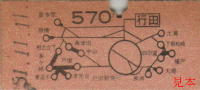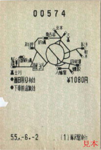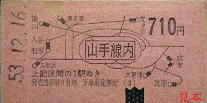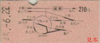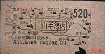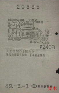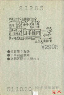 上記の規則改正により発行された山手線内からのA型地図式乗車券。山手線内から51q以上の近郊区間各駅に対して発売され、55年4月の規則改正(山手線内の適用範囲が101q以上に改められた)で廃止された。