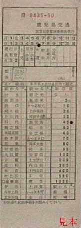 鹿児島交通に改称後の乗車券。上段は少し古いもので青地紋、下段は後期のもので赤地紋となっている。