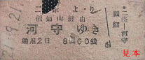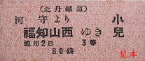 戦中の小児常備乗車券。福知山西の券は影文字入りだが、河守の券は印刷簡略化のため影文字が省略され黒で印刷されている。