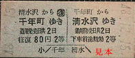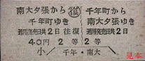 千年町発行の往復乗車券。左の券は古い様式で、往路片と復路片の地模色が異なっている。