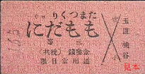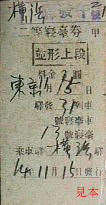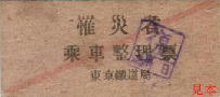 罹災者乗車整理票。太平洋戦争時、空襲等の罹災者に対し発行された整理票。各地区で様々な様式が存在するが、この券は東京鉄道局で使用された券でB型硬券となっている。
