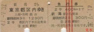 その際、余剰となっていた赤縦線入りの券紙を急行券に流用、100キロ用縦一本、200キロ用縦二本、400キロ用縦三本で使用された。