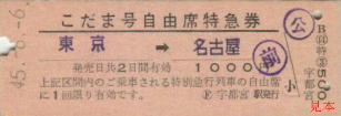 新潟印刷所D型こだま号自由席特急券。列車指定のないこだま号自由席特急券は昭和40年から発行された。昭和44年のモノクラス制施行後、新潟印刷場のみが赤地紋D型券となった。