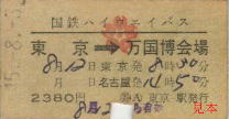万国博会場ゆきハイウエイバス乗車券。万博開催中にドリーム7号名古屋行きを万国博会場まで延長して運転された。
