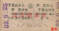 国鉄関東支社A型汽車区間用両矢印式乗車券。昭和33年1月23日から関東支社管内で試用された両矢印式券で、電車(電特)区間はB型、列車(汽車)区間はA型で発行された。(この券は列車区間用のA型)