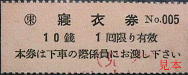 寝衣券。寝台車サービス向上のため、昭和9年10月25日から1等・2等寝台に浴衣が用意され、1回10銭で貸し出された際に発行された券。