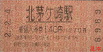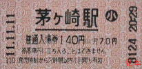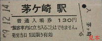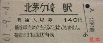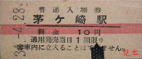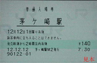 国鉄時代の券売機入場券。茅ヶ崎駅に券売機が設置された初日(橋上駅舎化初日)の物だが、印刷が劣化して殆ど判別不能である。