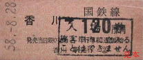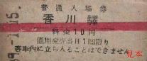 「香川」発行の乗車券代用入場券。香川駅では昭和40年代後半頃から入場券の設備はなく、最低運賃の乗車券に「入場券」のゴム印を押して代用していた。