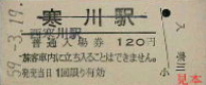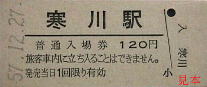 「寒川」の入場券を流用した「西寒川」の入場券。