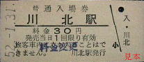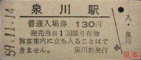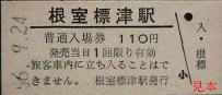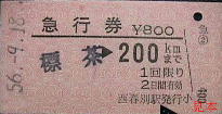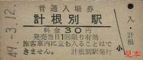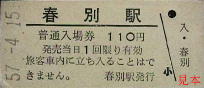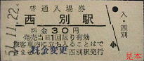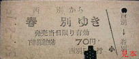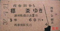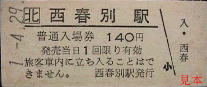 西春別発行の駅名補充急行券。かつては準急・急行列車も走った標津線であったが、晩年には優等列車は無くなっていた。