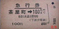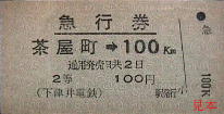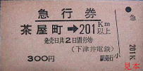 下津井電鉄発行の国鉄線急行券。左は二等級制時代の青地紋券、中央・右はモノクラス後の赤地紋券。