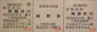 静波海水浴場への桟敷券付きD型往復乗車券。往復券の中央に桟敷券を配した特徴的な様式である。