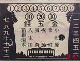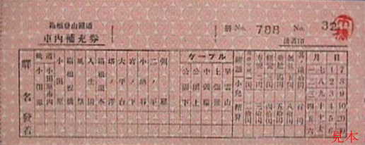昭和20年代の車内乗車券。発着駅欄の左端に軌道線用の小田原と小田原市内の欄が有る。