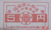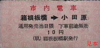 軌道線の箱根板橋・小田原発行の半硬券乗車券。赤刷りの「市内電車」の文字が軌道線用の券であること示している。