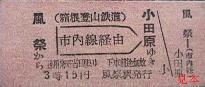 鉄道線から箱根板橋・市内線経由の硬券乗車券。矢印のような枠内に「市内線経由」と入った特異な様式。