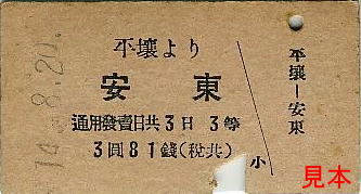 京義本線平壌(へいじょう)から南満州鉄道安奉線との接続駅安東(あんどう)ゆきの三等乗車券と、京元線清涼里(せいりょうり)から硯村(けんそん)ゆきのB型三等乗車券。