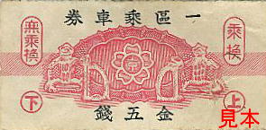 乗換券。薄紙を乱雑に切った粗末な券。