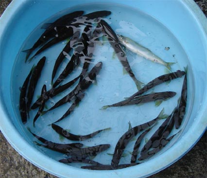 9時50分、梅木発電所平瀬橋から5分ほど下流を望むが竿の立つ気配なし。10時小川橋、もう橋の下でギラギラと鮎が石に絡んでいる様子がよく見える。10分ほど見ているが同じ人が立て続けに釣ったり、3〜4人が次々に鮎を掛けていた。結局、小川橋では最高で80匹、多い人で40〜50匹釣れたそうです。