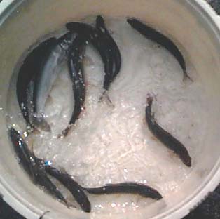 さて、本日の好鱗情報であるが、朝から約20名が好鱗前に入ったようだ。好鱗会の大津氏が1日で15匹、型は平均して15〜16cmといったところか。伊東の上村さんは10匹、型は良かったそうである。横浜から来たウナギ取りの名人(好鱗前で良くとっていくそうだ)は9匹、18cm前後と型がそろって釣れたそうである。その他では6〜8匹釣れたという釣り人が3〜4人いたそうである。